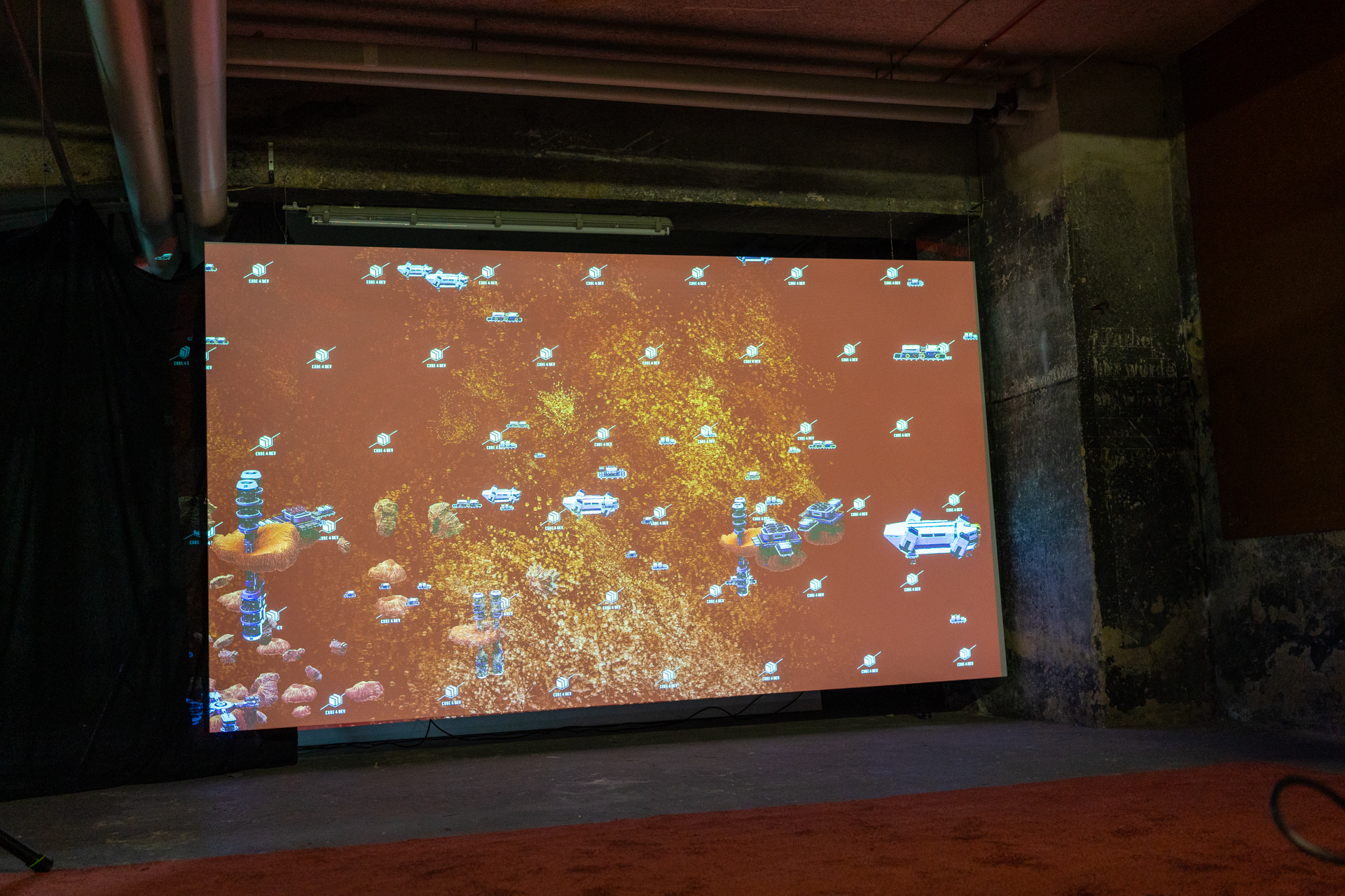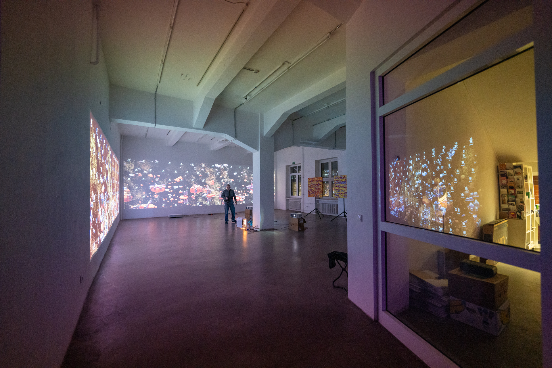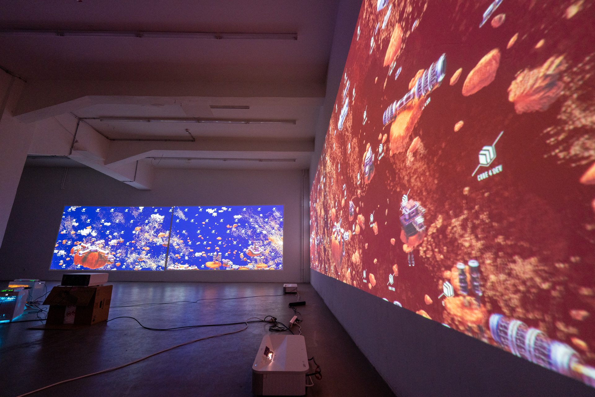 Hier sind verschiedene Installationen , mit einem , zwei und 4 Beamern zu sehen. Zum Einsatz kamen 2 Computer mit guten Grafikkarten und je zwei konventionelle 4K- Beamer und 4K-Kurzdistanzbeamer. Für die Interaktion wurden natürlich die entsprechenden 3D-Lidar-Scanner verwendet.